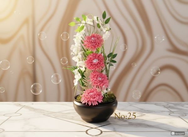 Seluna No:25, yumuşak pembe tonlarını siyahın asaletli derinliğiyle buluşturan, heykelsi bir tasarım harikasıdır. Siyah mat vazo üzerinde bir merdiven gibi yükselen katmerli pembe çiçekler, yaşam alanlarınıza hem hareket hem de dingin bir şıklık getirir. Beyaz salkımların eşlik ettiği bu dikey kompozisyon, dar alanlarda bile ferah ve etkileyici bir görünüm yaratmak için idealdir.