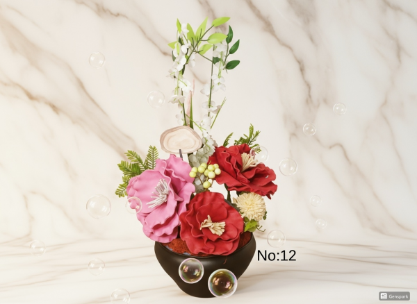 Klasik kırmızı çiçeklerin asaletini, modern tasarımın çizgileriyle birleştiren Seluna No:12, her bakışta farklı bir detayı keşfedeceğiniz özel bir çalışma. Mat siyah vazosu içerisinde parlayan pembe ve kırmızı büyük formlu çiçekler, araya yerleştirilen doğal ahşap dokunuşuyla sofistike bir hikaye anlatıyor. Arka planda yükselen zarif beyaz salkımlar ise bu canlı kompozisyonu ferahlatarak mükemmel bir denge sağlıyor.