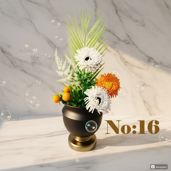 Seluna No:16, dikey formu ve seçkin materyal kullanımıyla modern dekorasyon anlayışını zirveye taşıyor. Siyah mat gövde ve gold (altın) tabandan oluşan kadeh vazosu, üzerindeki beyaz dokulu çiçekler ve turuncu egzotik meyve figürleriyle muhteşem bir kontrast oluşturuyor. Arka planda yükselen palmiye yaprağı formu, tasarıma derinlik ve tropikal bir hava katıyor.